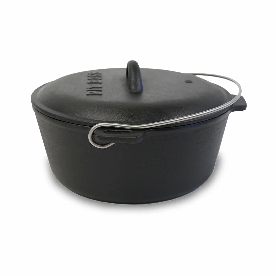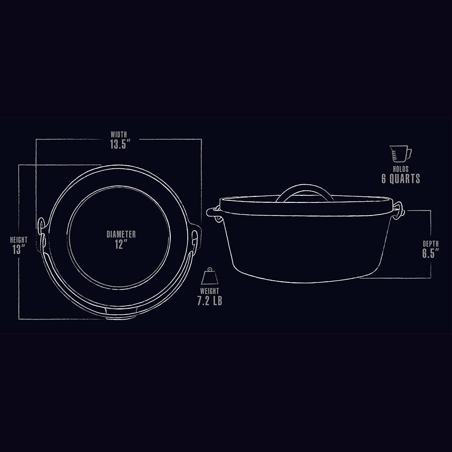 The Pit Boss® Cast Iron Dutch Oven is pre-seasoned and ready to use right out of the box. The kettle holds 6 quarts, has a 12” diameter, and can easily accommodate recipes for 10. It has built-in side handles, a looped lid handle, and a built-in thermometer notch with a lid arrow so you can insert a thermometer while keeping the lid closed.