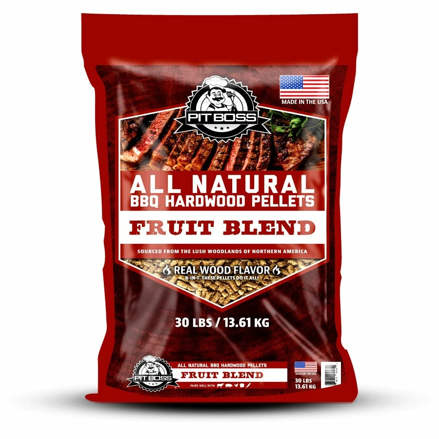 An infusion of wood-fired flavor is just what your next meal needs. Pit Boss® Fruitwood Blend Hardwood Pellets offer a mild smoky flavor with fruity undertones, designed to enrich the taste of pork, poultry, seafood, and baked goods. Fuel up with our Fruitwood Blend when you grill shrimp or chicken, bake a cobbler, or smoke any of your favorite meats. This mouthwatering all-natural blend has everything you want (cherry, apple, and maple hardwoods) and none of what you don’t (scents, sprays, chemicals, or glues.)Â