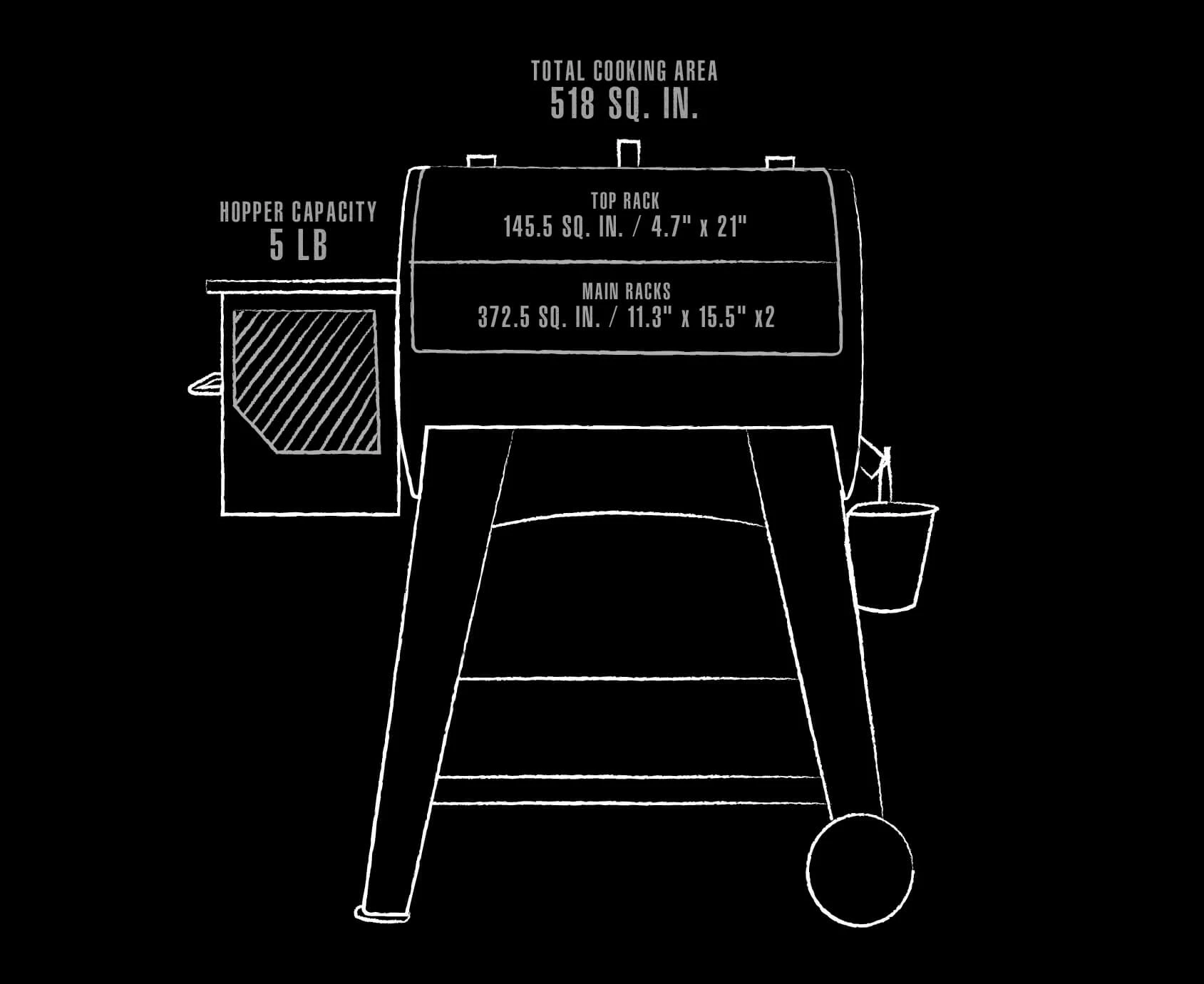 Additional features include 2 in-line style wheels, a high-temp powder coat finish, durable steel construction, hopper clean-out, and a 200 watt auto igniter, all backed by our best-on-class 5-year warranty.