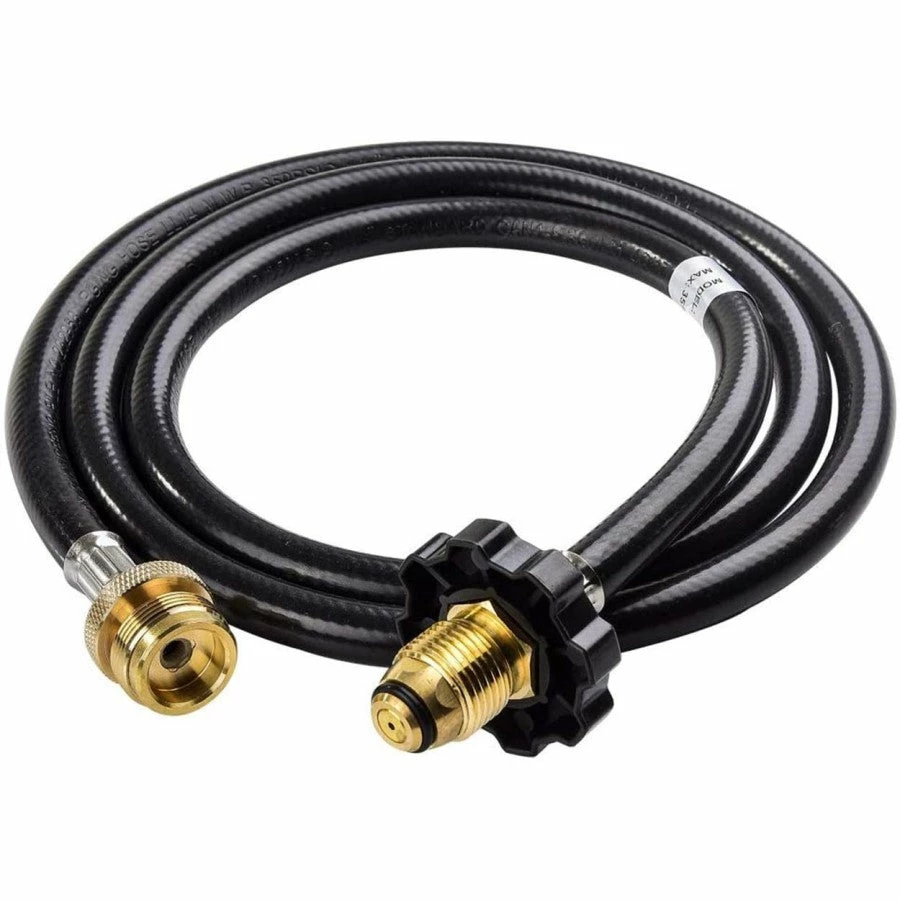 This propane adapter hose is 5 feet long and allows you to connect a 1 lb. propane tank line to an 20 lb. propane tank.